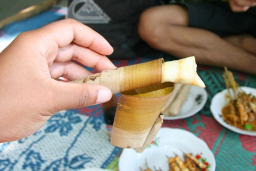 Ça, ce sont des bâtons de riz… enveloppé dans des feuilles de cocotier (je crois), on verse un tiers de riz cru puis referme le paquet. Ensuite, on fait bouillir l’ensemble un moment (pas trop longtemps pour que ça soit bien gluant), on laisse refroidir et il n’y a plus qu’à déguster, c’est un délice !