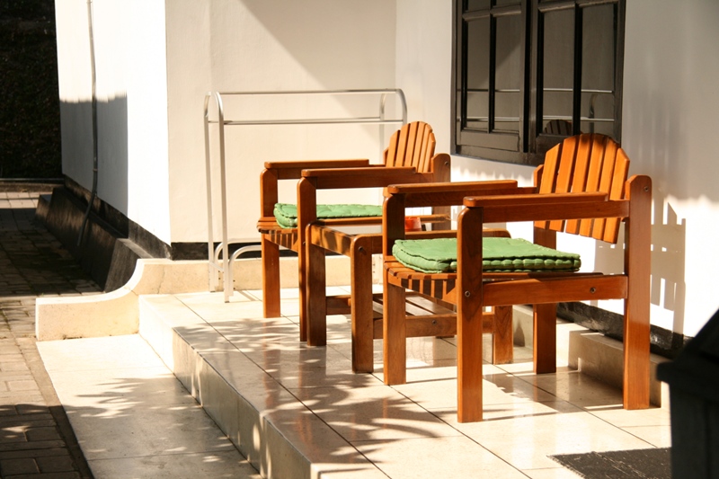 Toutes les chambres disposent d’une petite terrasse et leurs fauteuils donnant sur le beau jardin de la famille.