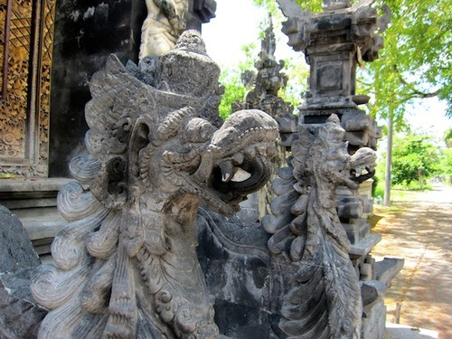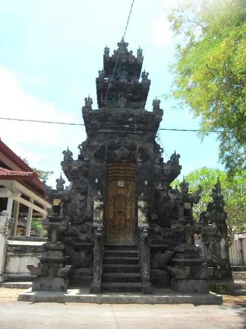 Au retour, je ne me sens pas de pédaler jusqu’au Wahyu, je demande donc à Made de m’accompagner jusqu’au pont jaune. Il propose que son fils prenne mon vélo contre quelques roupiah pour s’acheter des pétards à l’approche du réveillon. Il ne me reste que 20 000 sur moi, je les lui donne. Sur son scooter ultra-tunné (pot d’échappement arc-en-ciel, siège en cuir beige et capitonné de boutons dorés par exemple), nous suivons Komang qui peine rapidement à pédaler (le vélo était bien trop grand pour lui). Heureusement, nous croisons un copain à lui qui prend le relai. En chemin, nous nous arrêtons chez Made qui me montre les 5 bungalows et la piscine qu’il est en train de construire. Ce sera prêt en avril prochain me dit-il pour un prix autour de 400 000 la nuit « but maybe free for you ! » !