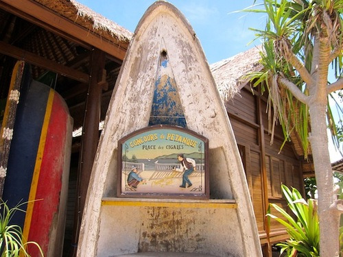 Je continue au bout de la route nord de la mangrove qui finit en cul-de-sac. Ca m’a fait rire cette petite place avec un banc de sable au bout duquel trône la pancarte de la pétanque