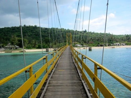 Mes esprits repris, je regarde le pont. Entre nous, je me suis dit « Tout ça, pour ça ?! » ! Lorsque l’on est pas dessus, on se demande l’intérêt qu’à ce pont mais dès qu’on l’emprunte, on comprend mieux (c’est peut-être tout subjectif). Des lattes de bois servent de chemin entre toute cette ferraille jaune, parfois avec de sacrés écarts, ça donne un côté sensationnel à la traversée (uniquement réservée aux piétons, vélos et scooters). Une fois dessus, on voit cette eau turquoise magnifique et on a une vue assez surprenante de part et d’autre. Sur la droite, on voit l’océan, sur la gauche l’océan aussi mais on dirait davantage un lac, le paysage est totalement différent (il faut y être pour comprendre) ; derrière moi, la belle Lembongan, devant moi, la sauvage Ceningan.