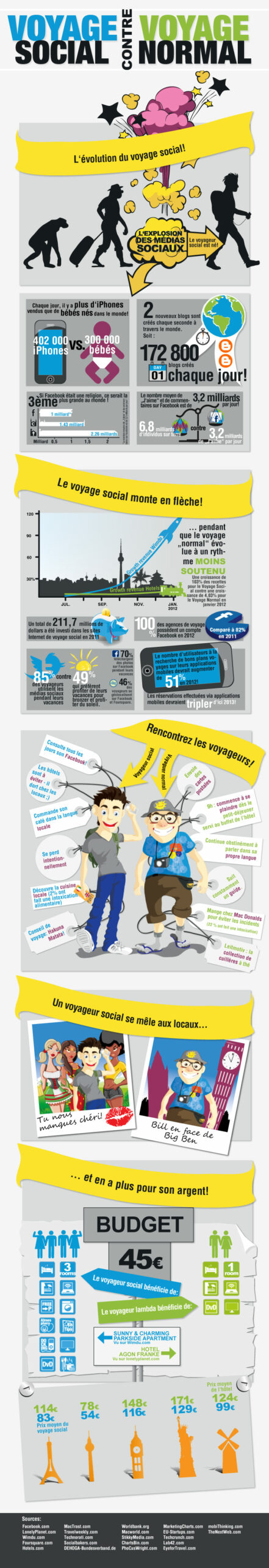 On y apprend notamment qu’il y a plus d’iphone vendus que de naissances chaque jour dans le monde, que 2 blogs sont créés chaque seconde dans le monde ou encore que le voyageur social se perd volontairement durant ses voyages tandis que le voyageur normal reste suspendu à son guide !
